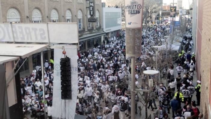 WINNIPEG – Police said about 35,000 fans celebrated in the streets as the Winnipeg Jets advanced to the second round of the NHL playoffs Friday evening..