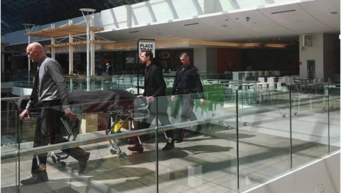 In the early afternoon, a section of the food court closest to the washroom was cordoned off entirely and media were asked to move back. At around 3 p.m., the body, shrouded in a black blanket, was wheeled out.