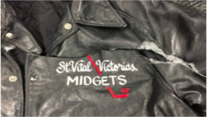 He was wearing a grey, twill baseball cap, a waist-length black leather jacket (St Vital Midgets Hockey patch on left breast), a waist length dark blue vinyl windbreaker (Canadian Utility Construction patch on left breast), acid wash blue jeans (36×30) and blue Skechers runners (size 10.5).