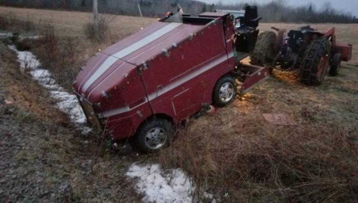 WINDSOR, N.S. — The powerful storm that battered Eastern Canada Monday had an unexpected casualty −− a Zamboni found in a ditch near Windsor, Nova Scotia, without a rink in sight.